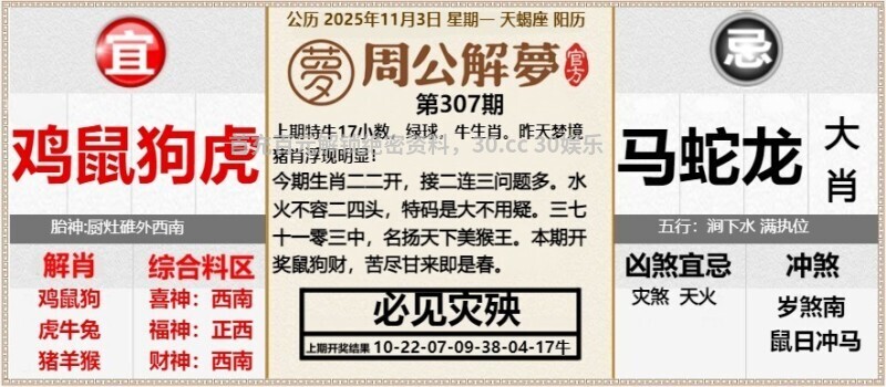 | 307期:七肖 | 兔龙鸡猪狗蛇虎 | 开:狗20 |